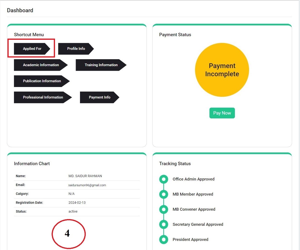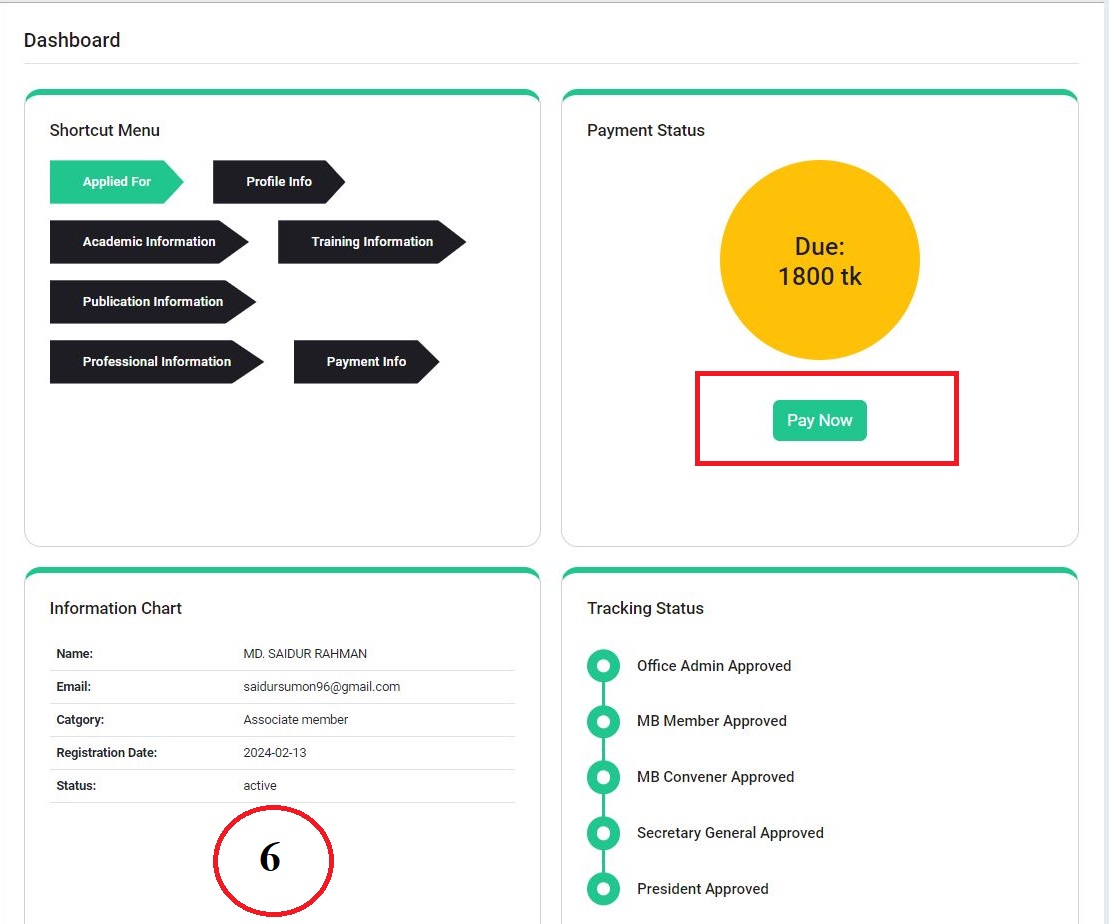 (৪) আপনার Dashboard এ প্রবেশ করুন। এবার আপনার information (academic, address etc) গুলো পূরণ করে profile সম্পূর্ণ করুন।