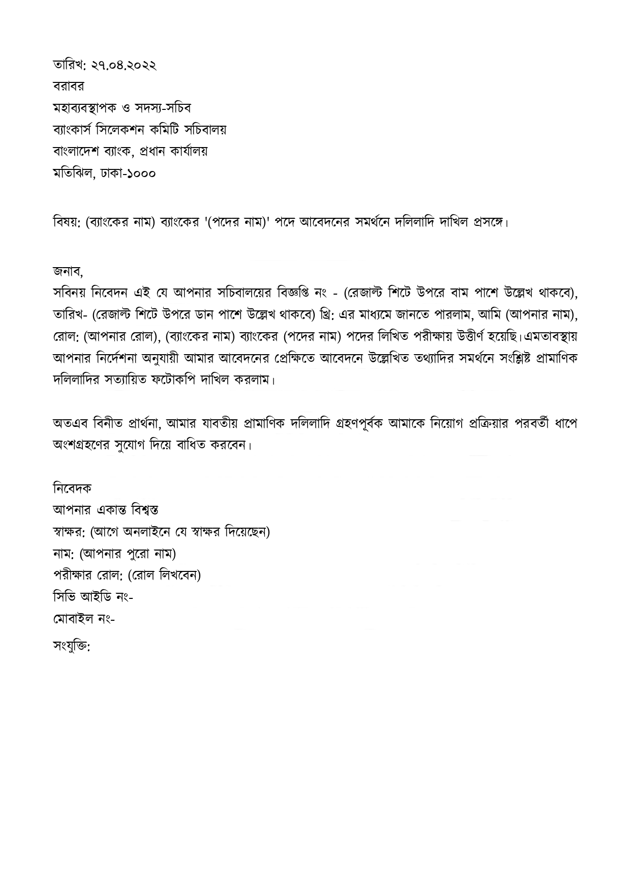 ব্যাংকার্স সিলেকশন কমিটি সচিবালয়ের মৌখিক পরীক্ষায় "পরিচালক (BSCS) ও সদস্য-সচিব, ব্যাংকার্স সিলেকশন কমিটি সচিবালয়, বাংলাদেশ ব্যাংক, প্রধান কার্যালয়, ঢাকা" বরাবর প্রার্থীর নিজ স্বাক্ষরযুক্ত স্বহস্তে লিখিত আবেদনপত্রের নমুনা।